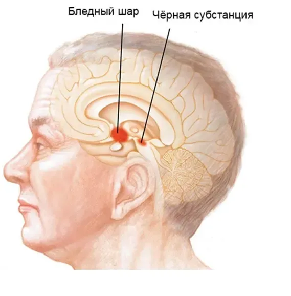 Гибель дофаминовых нейронов: Основной механизм болезни связан с разрушением клеток чёрной субстанции мозга, отвечающих за выработку дофамина — важного нейромедиатора, регулирующего движения