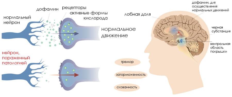 Гибель дофаминовых нейронов: Основной механизм болезни связан с разрушением клеток чёрной субстанции мозга, отвечающих за выработку дофамина — важного нейромедиатора, регулирующего движения