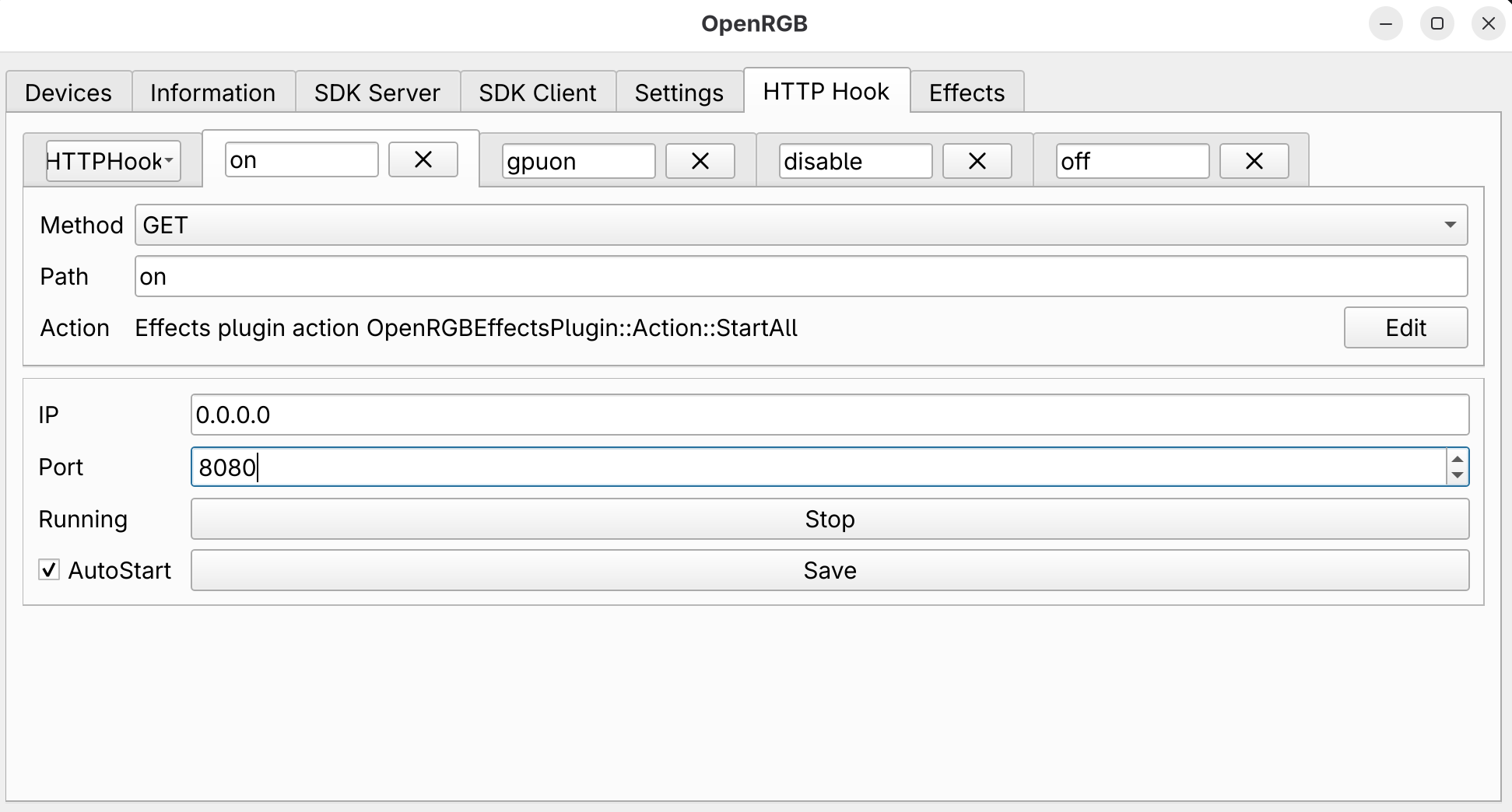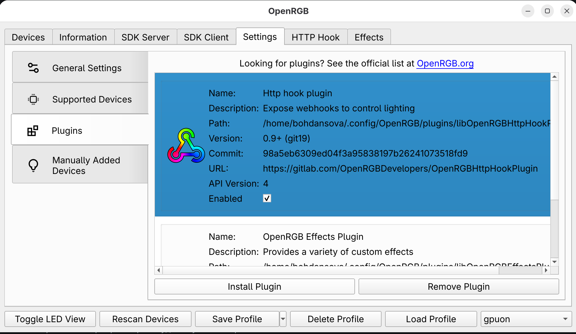 Openrgb HTTP-HOOK Plugin (UPD) Разное • 8 окт. 2024 г. Самое простое решение для поднятия веб-сервера с поддержкой управления эффектамиGitlab страница проектаВ подключаемых модулях добавляем наш модуль для хука В настройках самого модуля создаем необходимые точки которые будем прозванивать и настраиваем сервер который будет слушать запросы Рекомендуем Новости ORICO представила свой "Mac mini Pro" месяц назад • 1 минута на чтение Новости Баг диспетчера задач KB5067036 Windows 11 месяц назад • 1 минута на чтение Новости Super Resolution Youtube месяц назад • 1 минута на чтение