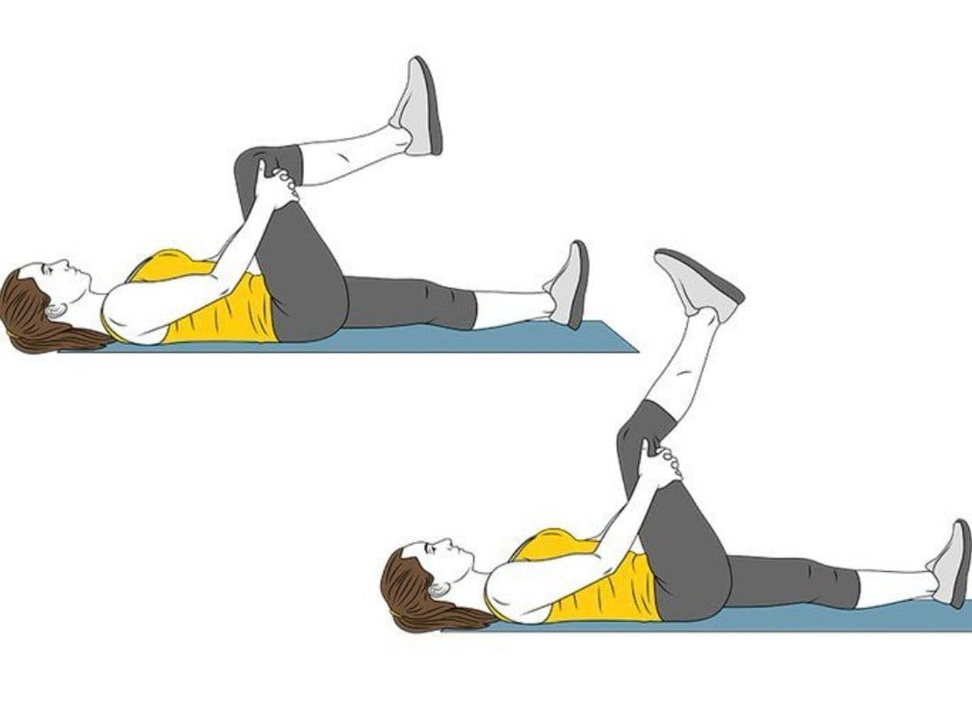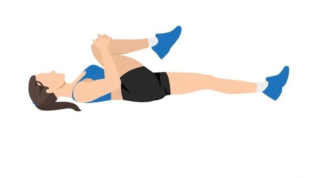 - Растяжка ягодичной мышцы лежа (поза «колено к груди»)